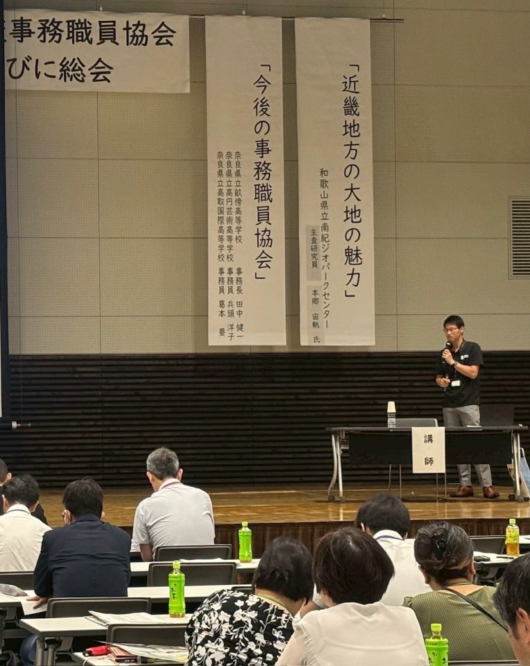 6月27日(金)に、第78回全国公立高等学校事務職員協会近畿支部研究大会(和歌山県立情報交流センター Big・U、田辺市)が開催され、専門員が「近畿地方の大地の魅力:陸から海まで」と題して講演をしました。近畿地方には活火山が無いのに温泉が湧くことや、近畿地方の地形の特徴と人々の暮らし、サンゴに注目した防災のことなどについて話しました。