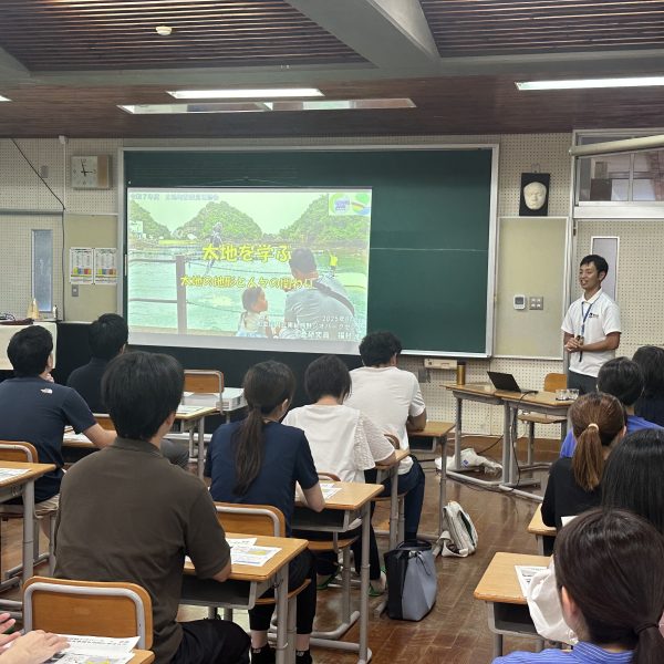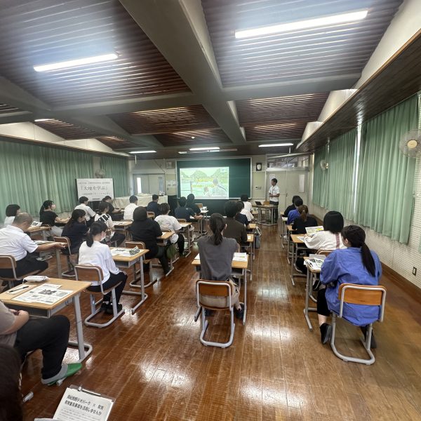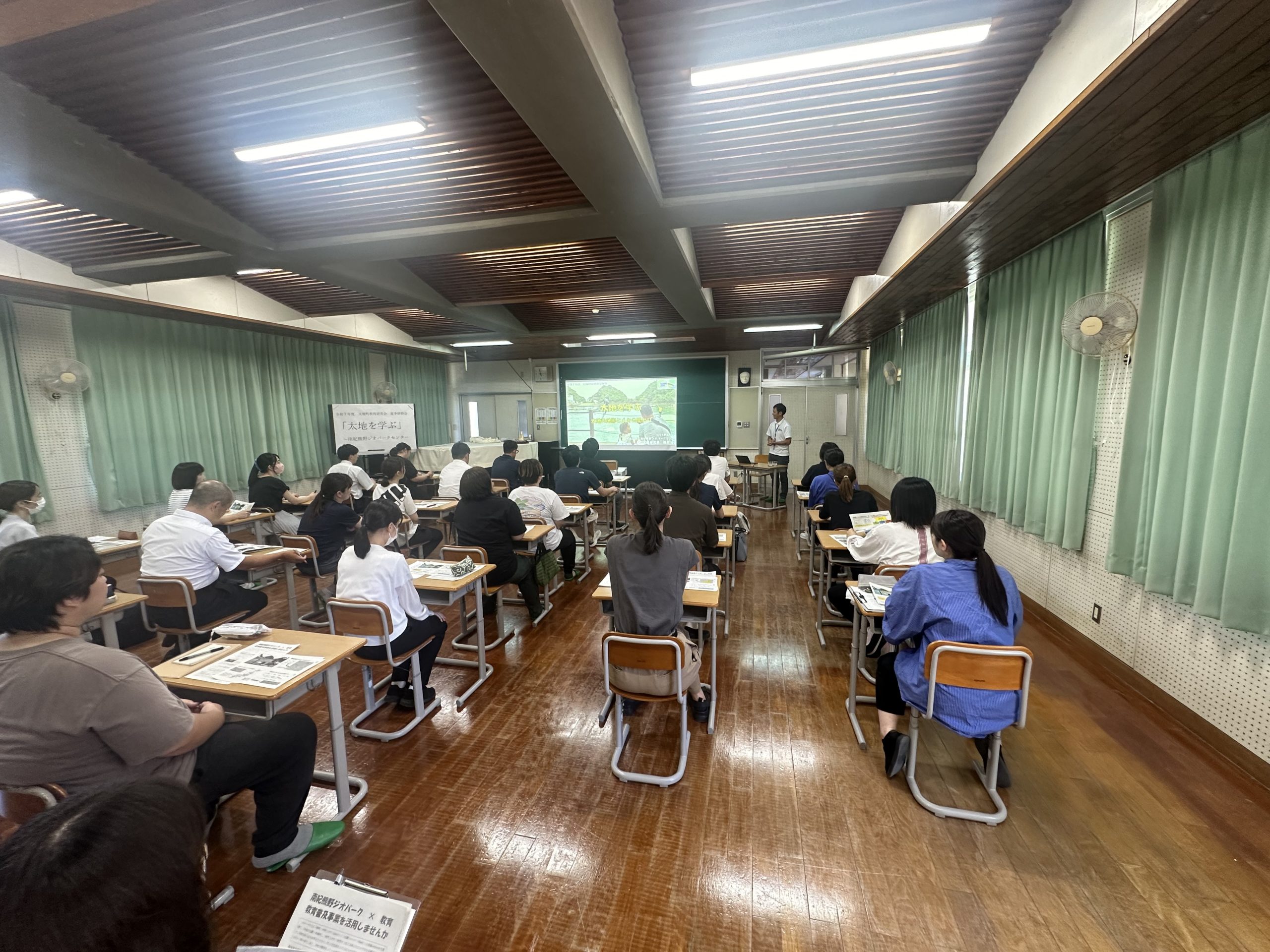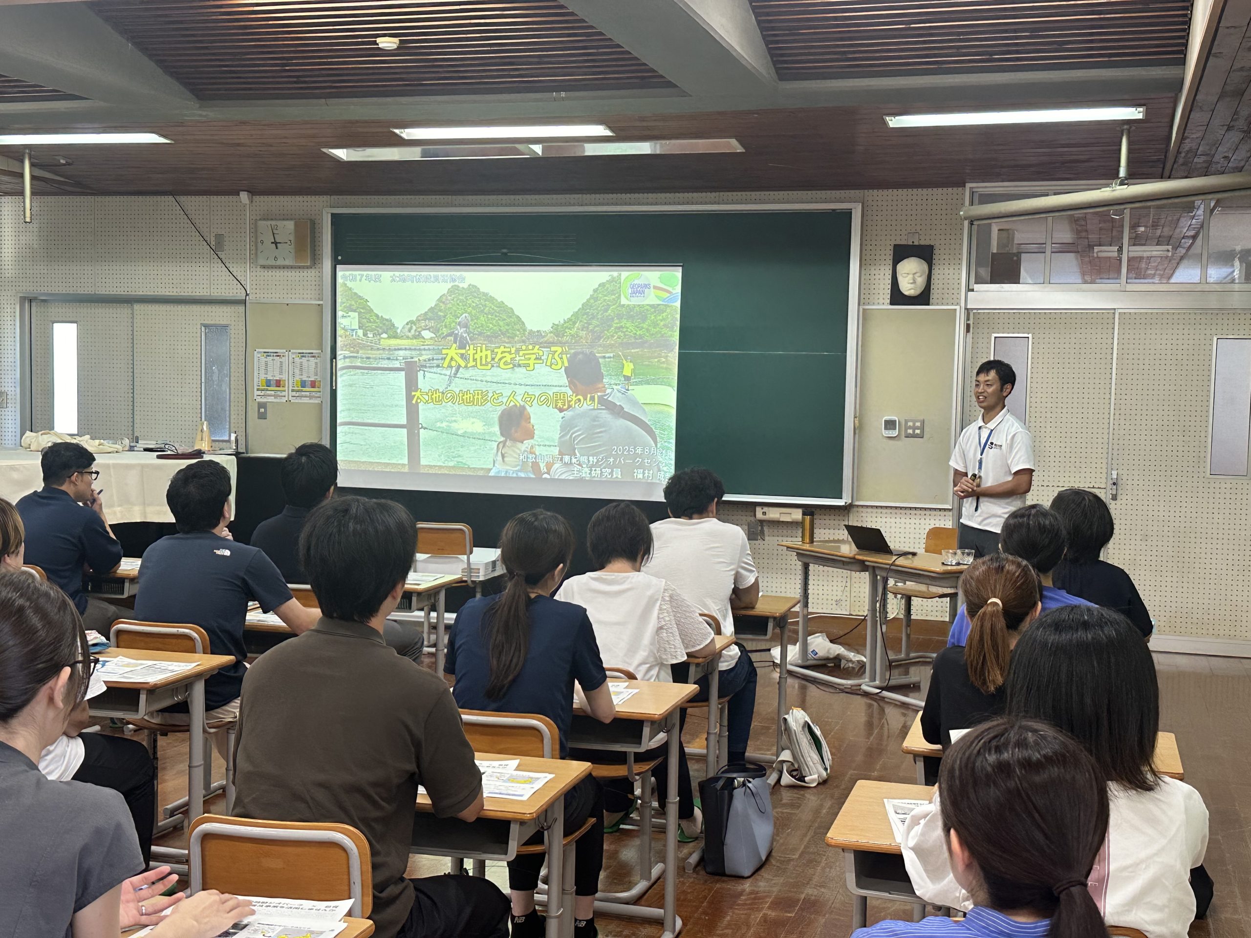 ホーム 日々の活動 太地町教職員研修で講演しました 2025.08.22 太地町教職員研修で講演しました 8月21日(木)に行われた太地町教職員研修にて、ジオパークセンターの専門員が「太地を学ぶ」と題して講演をしました。ジオパークの取り組みについての話を始め、特に太地町の地質や地形、そして、人々の関わりについて話をしました。