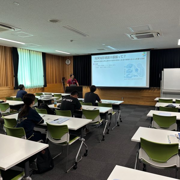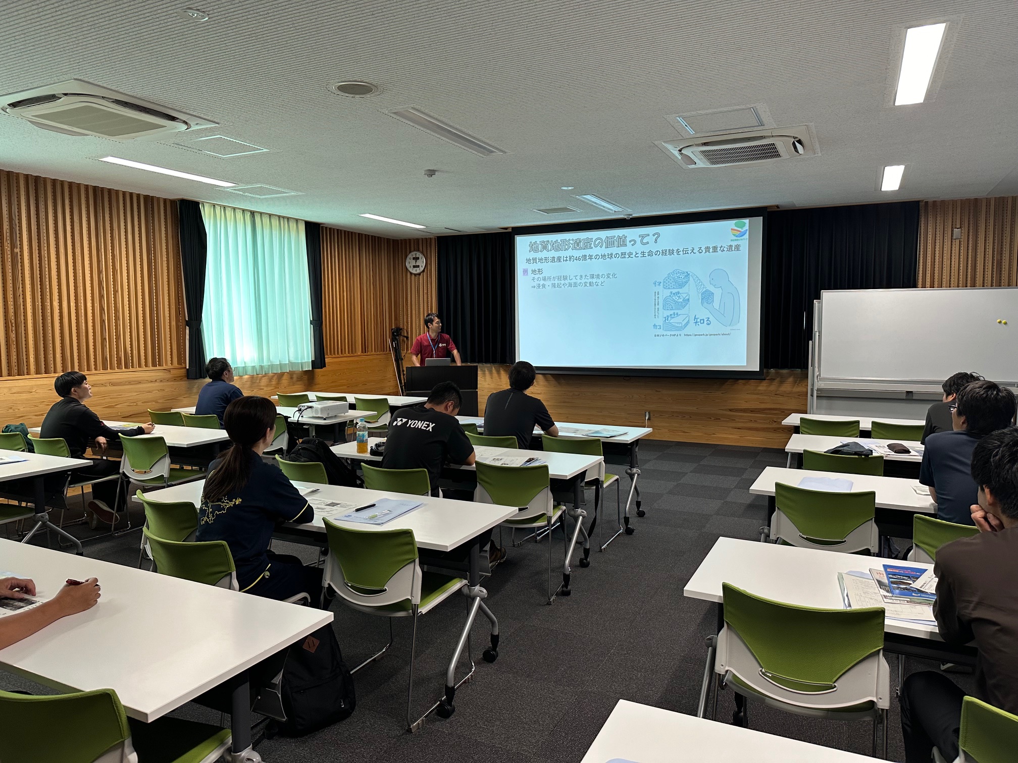 ホーム 日々の活動 中堅教諭等資質向上研修を実施しました 2025.08.27 中堅教諭等資質向上研修を実施しました 8月22日(金)、8月25日(月)に、ジオパークセンターにて中堅教諭等資質向上研修(選択研修)を実施しました。この研修は、在籍年数が10年に達した先生方を対象に行っているもので、ジオパークの考え方を理解してもらい、南紀熊野ジオパークを活用した教育活動を実践するために実施しています。大地の成り立ちや自然、歴史文化について学びを深めてもらいながら、実際に潮岬周辺をフィールドワークしたり、センター内を見学しました。
