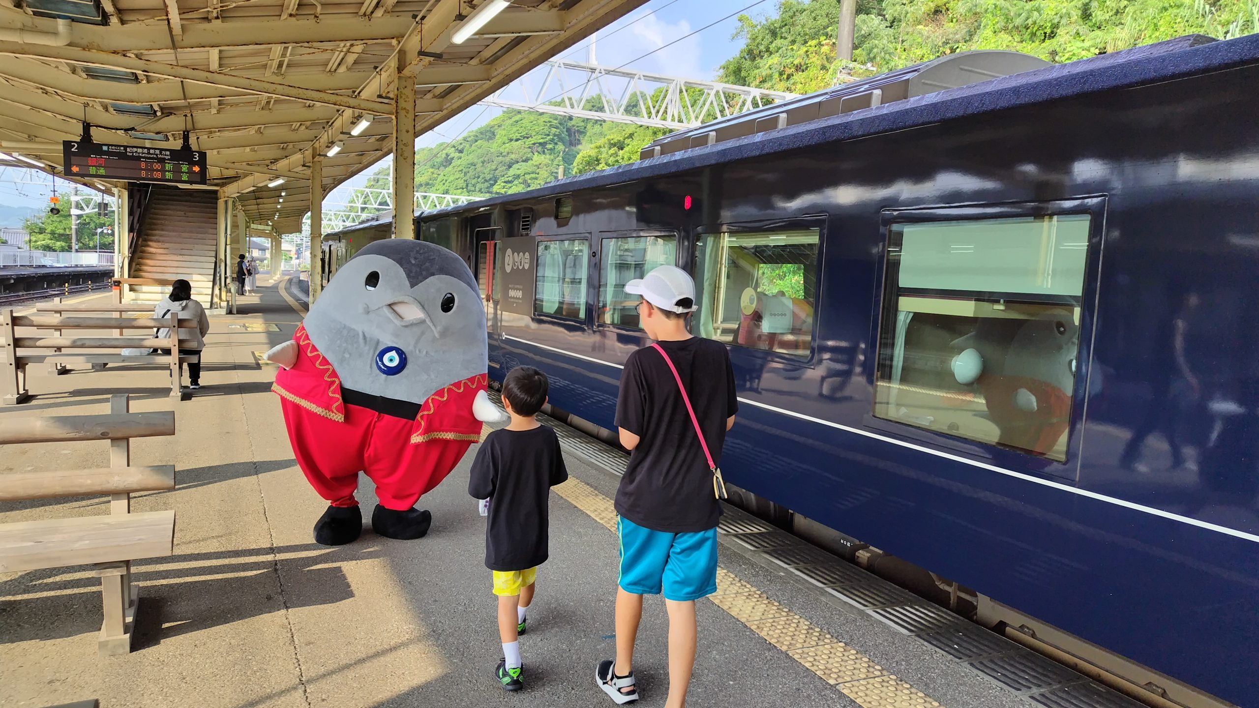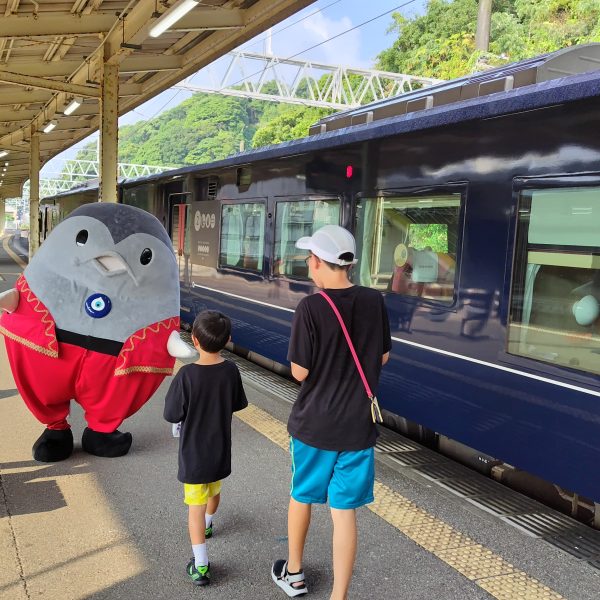串本町のマスコットキャラクター「まぐトル」も、朝から乗客の皆さんをお出迎えしました。