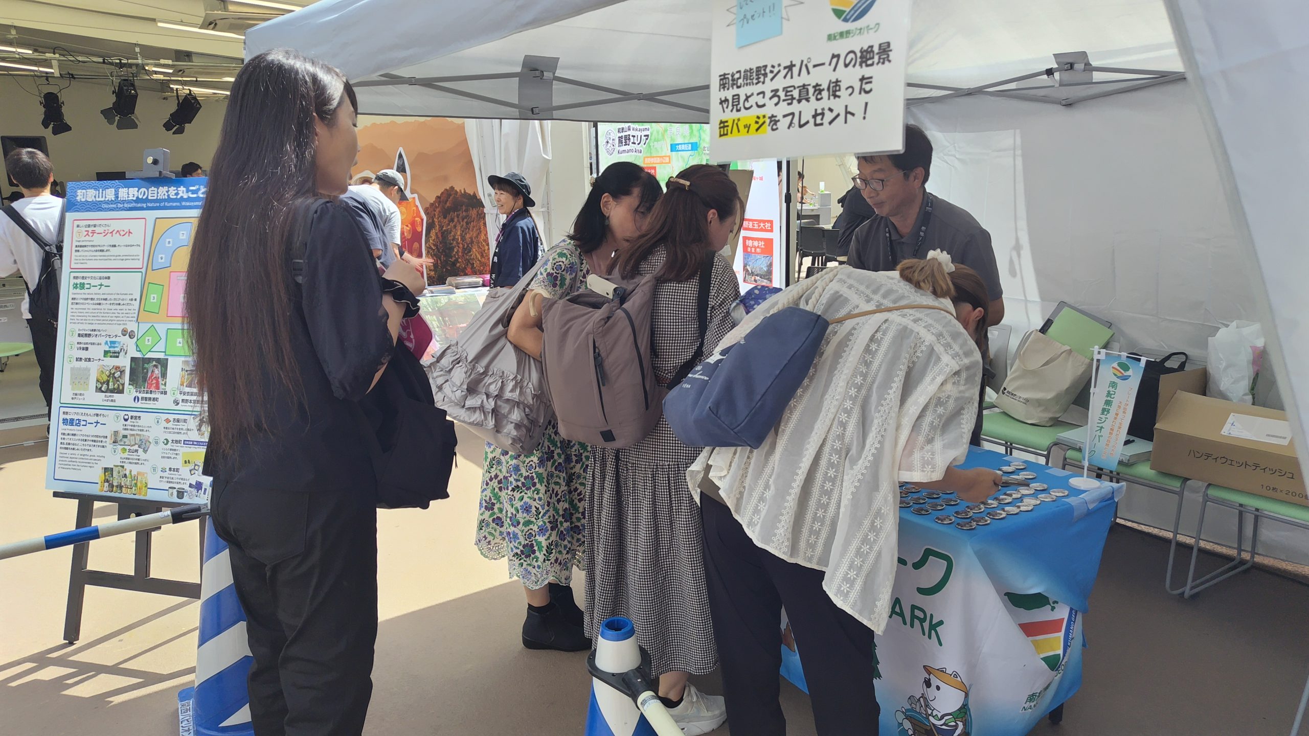 南紀熊野ジオパークのPRブースへ来られた多くの来場者には、大阪・関西万博公式キャラクター「ミャクミャク」と、南紀熊野ジオパークのおすすめスポットの写真が入った缶バッジをプレゼントさせていただき、地域の魅力をお伝えしました。