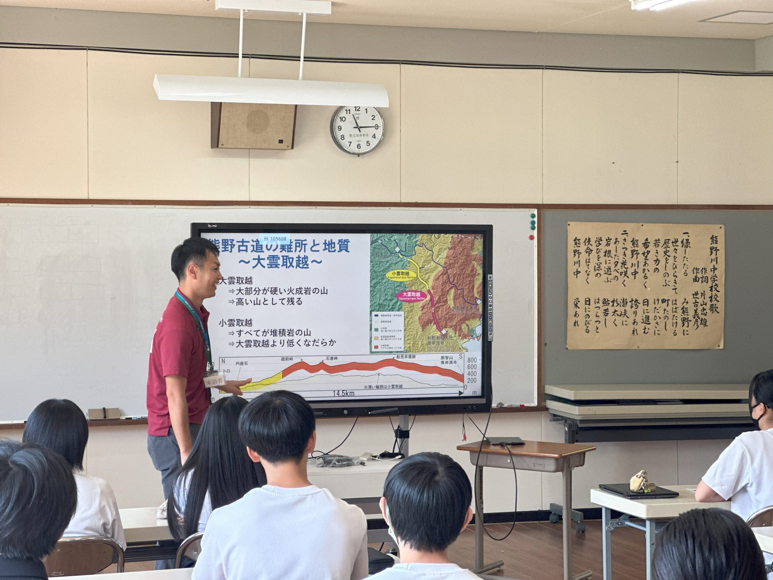 今年度、新宮市立熊野川中学校では、熊野曼荼羅の鑑賞教育を行っています。その中で生徒たちは実際に熊野曼荼羅の絵解きを聞き、今後、自分たちで絵解きを行うという取り組みをしています。その一環として、10月1日(水)に、ジオパークと世界遺産に関係について、専門員が授業を行いました。生徒たちの絵解きの実演については、他の地域のジオパークとオンラインで繋いで行う取り組みもしたいと考えています。