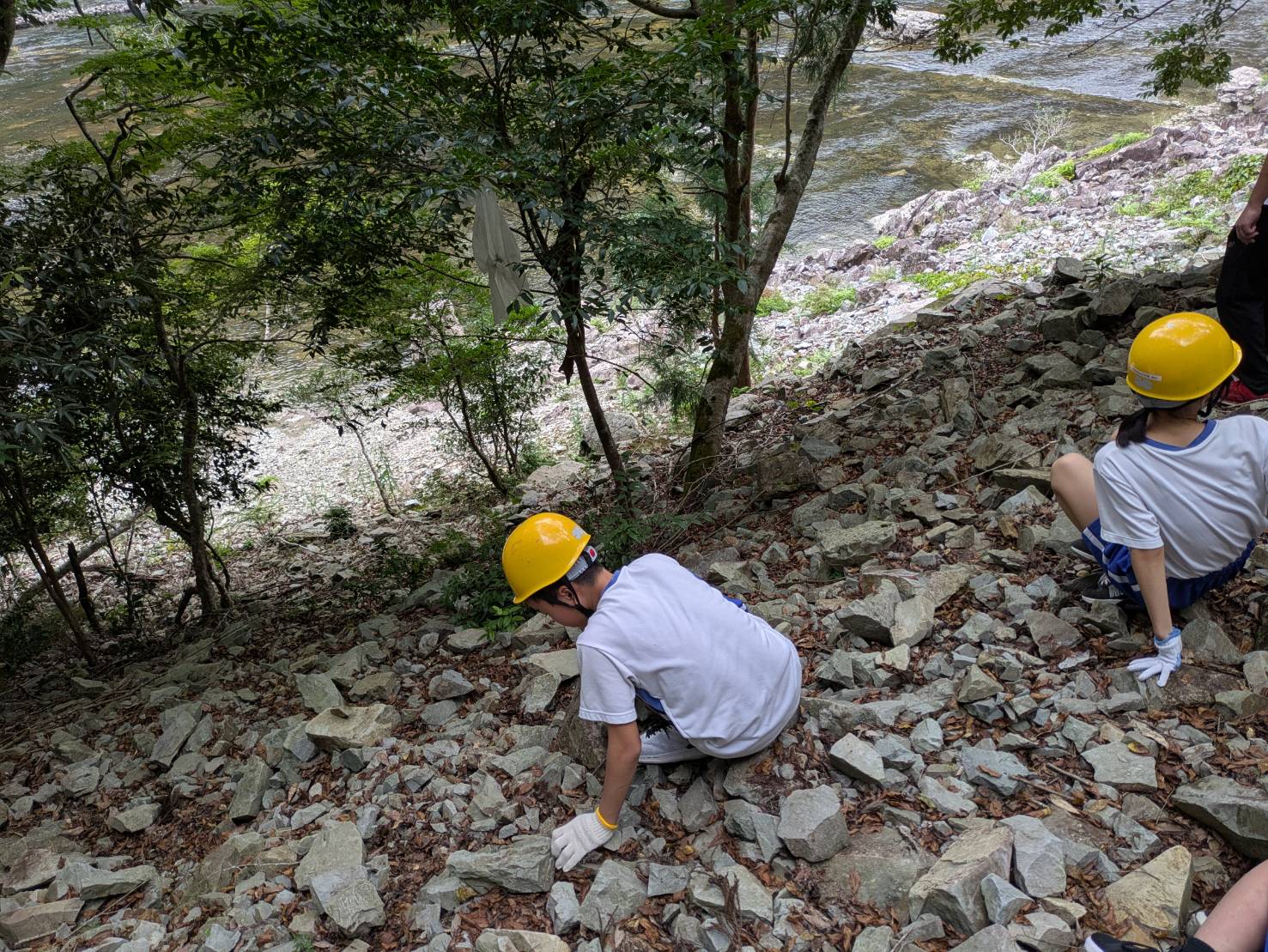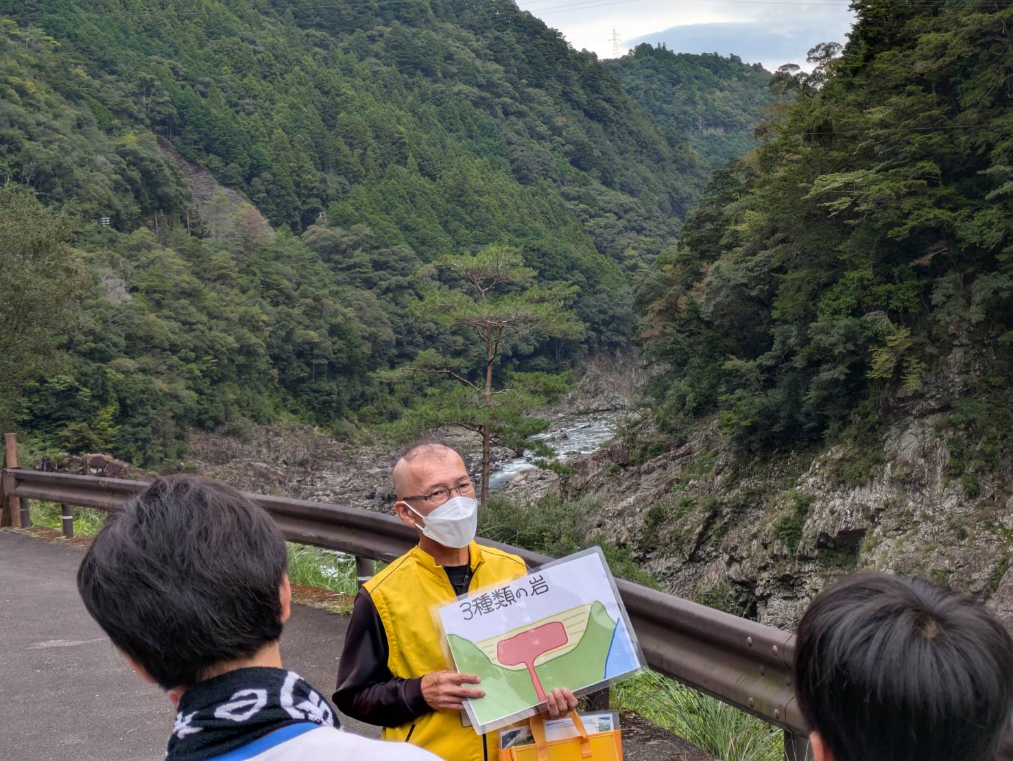 ホーム 日々の活動 ジオパークガイドが出前授業(フィールドワーク)をしました 2025.10.02 ジオパークガイドが出前授業(フィールドワーク)をしました 9月29日(月)に、北山村立北山中学校1年生の地域学習の一環として、村内にあるジオサイトなどでフィールドワークを行いました。参加した生徒の皆さんは、ジオパークガイドの話を熱心に聞きながら、地層の観 察や化石探しなどを行いました。 この授業はジオパークに関する学習会にガイドを派遣し、学習に関する活動を支援する教育普及事業を利用して行われました。ジオパークを活用した教育支援を積極的に行っていますので、興味関心がありま したらぜひジオパークセンターにご連絡ください。