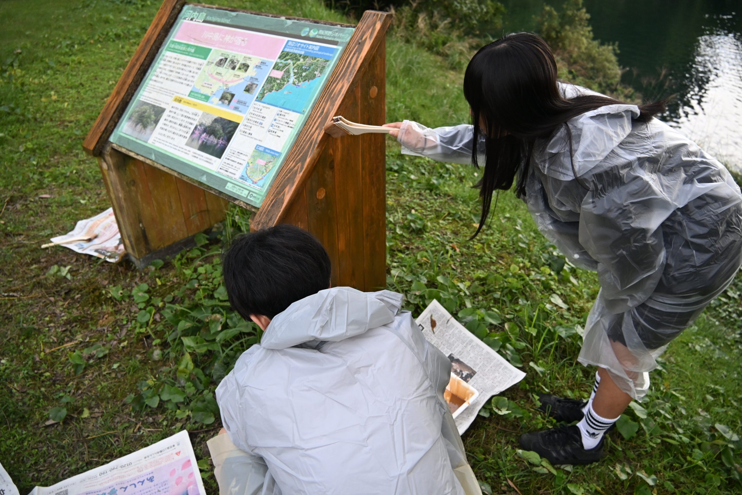 本日は、ジオパーク見どころに設置している案内看板の土台の清掃活動を行いました。まずはじめに土台の汚れを取るために研磨機を用いて綺麗にしていき、その後、保護用のペンキにて塗装を行いました。慣れない作業でしたが、参加生徒たちは一生懸命取り組み、1時間程度で綺麗に仕上げることができました。今後、他の案内看板も同様に清掃活動を行っていく予定です。