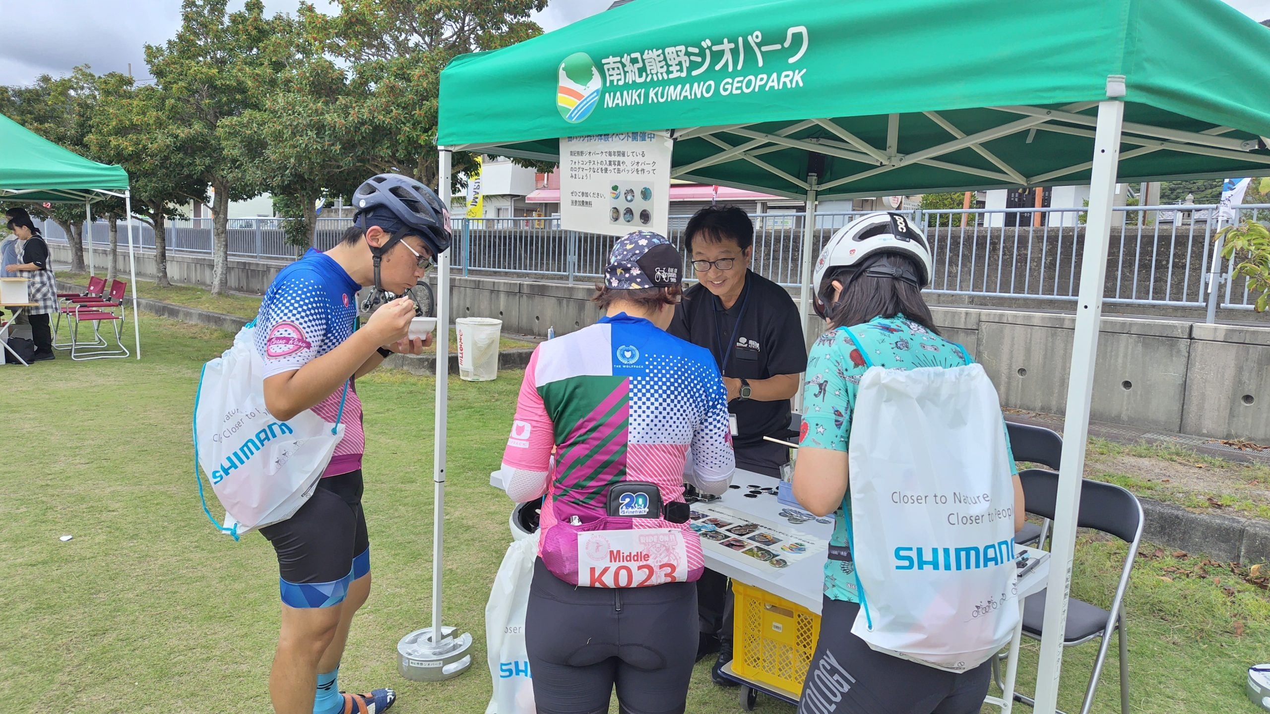 ホーム 日々の活動 ライドオンすさみ2025にて南紀熊野ジオパークのPRを行いました 2025.10.19 ライドオンすさみ2025にて南紀熊野ジオパークのPRを行いました 10月19日(日)に、すさみ町や古座川町を舞台に開催されたサイクリングイベント「ライドオンすさみ2025」へブース出展し、南紀熊野ジオパークのPRをしました。 ブースへは、レース終了後のサイクリストがお越しになり、地域の絶景写真を使用した缶バッジをプレゼントして、地域の魅力をお伝えしました。