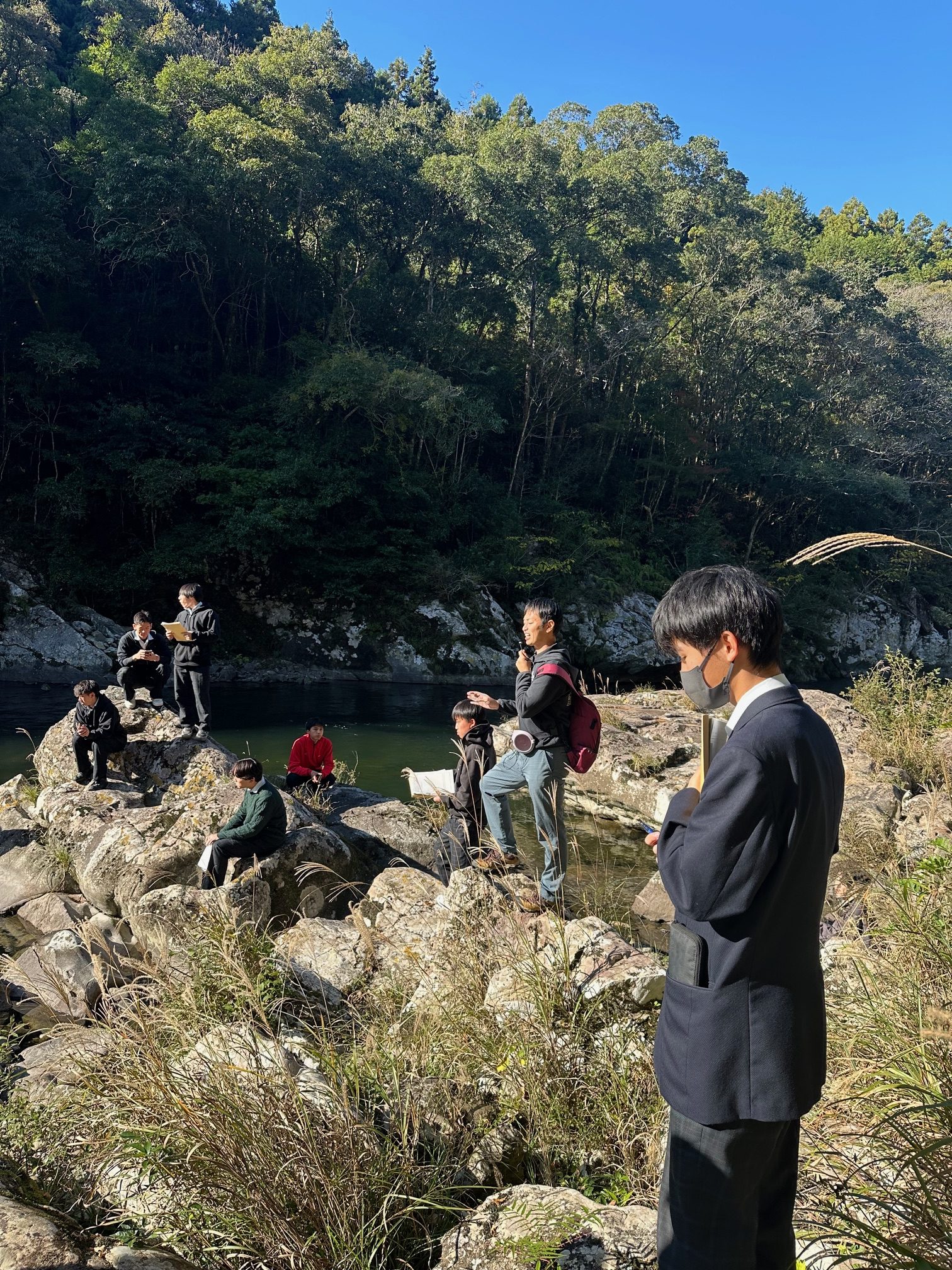 ホーム 日々の活動 ジオパーク学の授業を行いました 2025.11.20 ジオパーク学の授業を行いました 11月20日(木)に、串本古座高校で実施しているジオパーク学探究の授業を行い、古座川町にある「真砂の舟着き場跡」に行ってきました。 真砂の舟着き場跡は、川の浸食によって削られた地形をうまく利用していた川港跡で、かつては河川交通の拠点として利用されていた場所です。 生徒たちは、なぜこの場所が舟着き場だったのかなどを専門員と一緒に考えながら、かつての人や物資の行き来を支えた歴史や文化について学びを深めました。