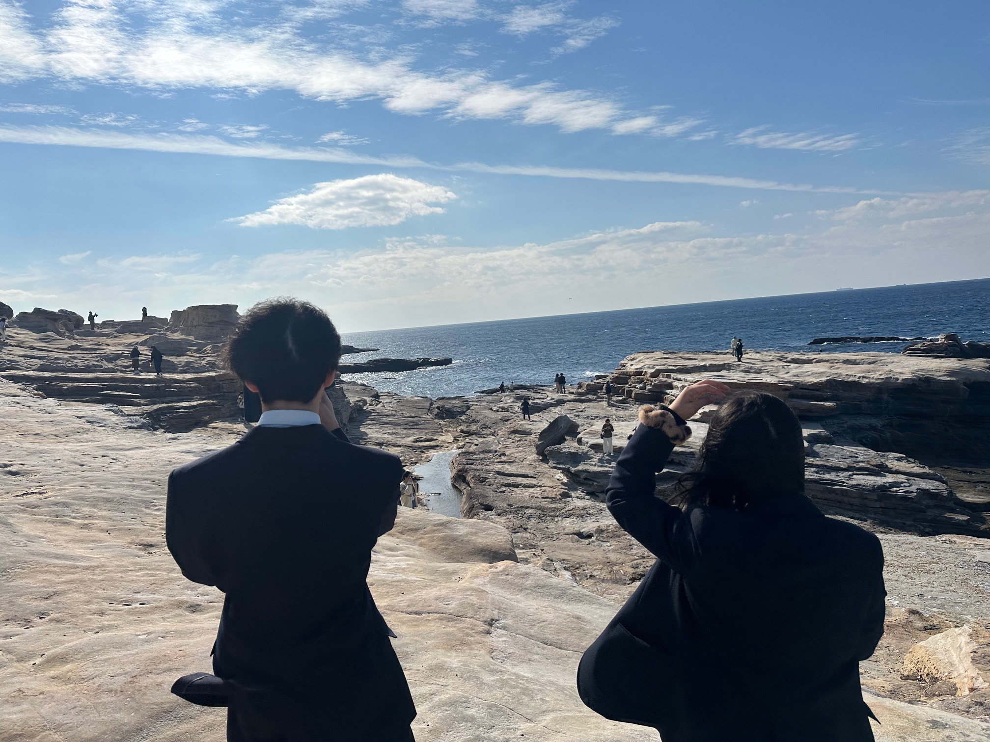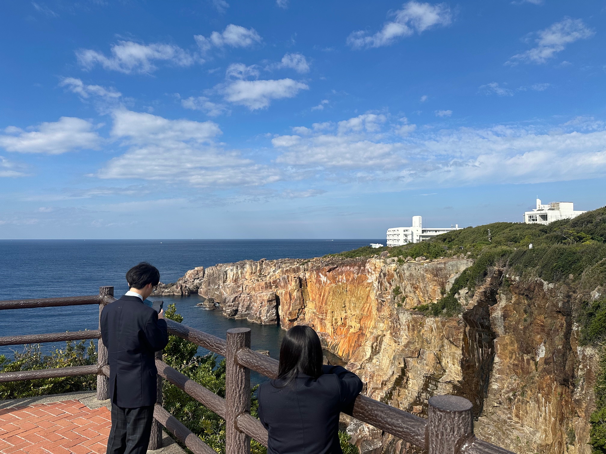 最終日は1日の体験時間があるために、南紀熊野ジオパークの西エリアにサイトの見守りに出かけました。サイトに訪れて、その成り立ちなどを学習しながら、サイト看板に異常がないか、ごみ等が落ちていないかを確認しました。1日かけて10か所のサイトの点検を行い、生徒たちも行ったことのないところばかりで、改めて南紀熊野ジオパークの魅力を再確認していました。