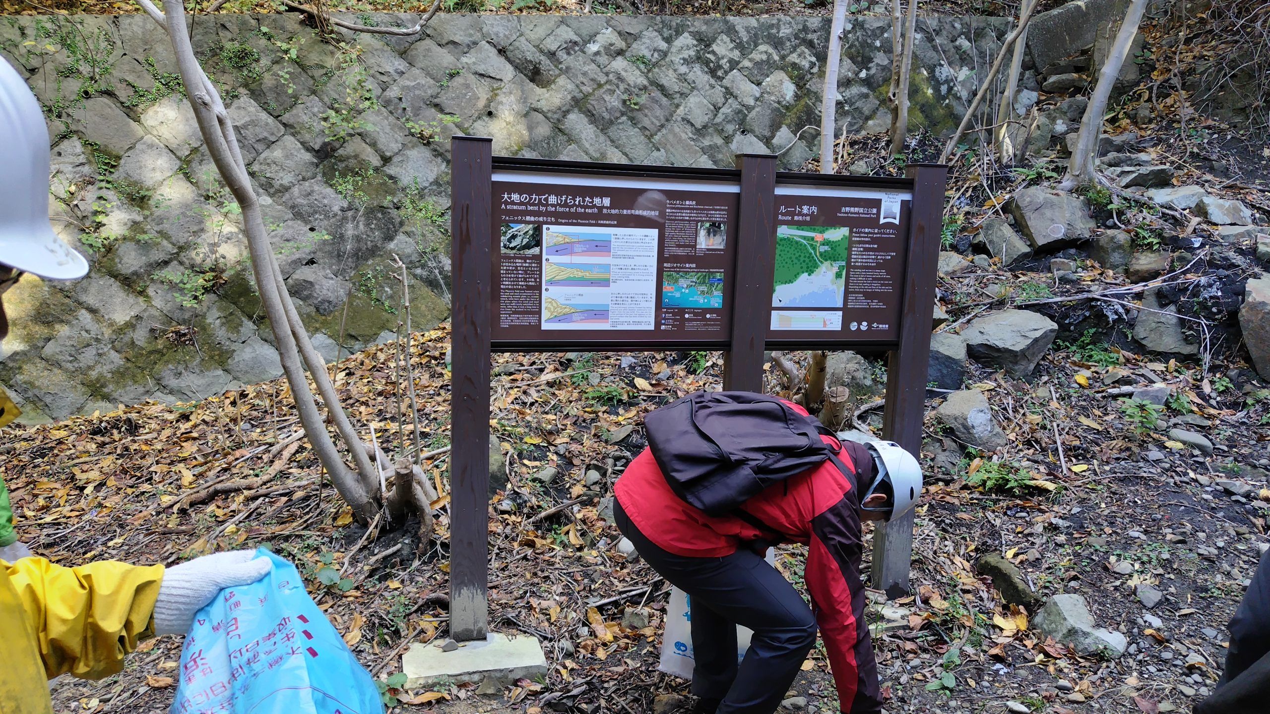 フェニックス褶曲へ見学にお越しになる多くの方に、安全に気持ちよく楽しんでいただけるよう、フェニックス褶曲園地運営協議会(事務局:すさみ町役場)により定期的に実施されている巡視であり、環境省や観光協会、ジオパークガイドの会、ジオパークセンターにより、共同で園地内の清掃活動や危険個所の有無について点検を行いました。
