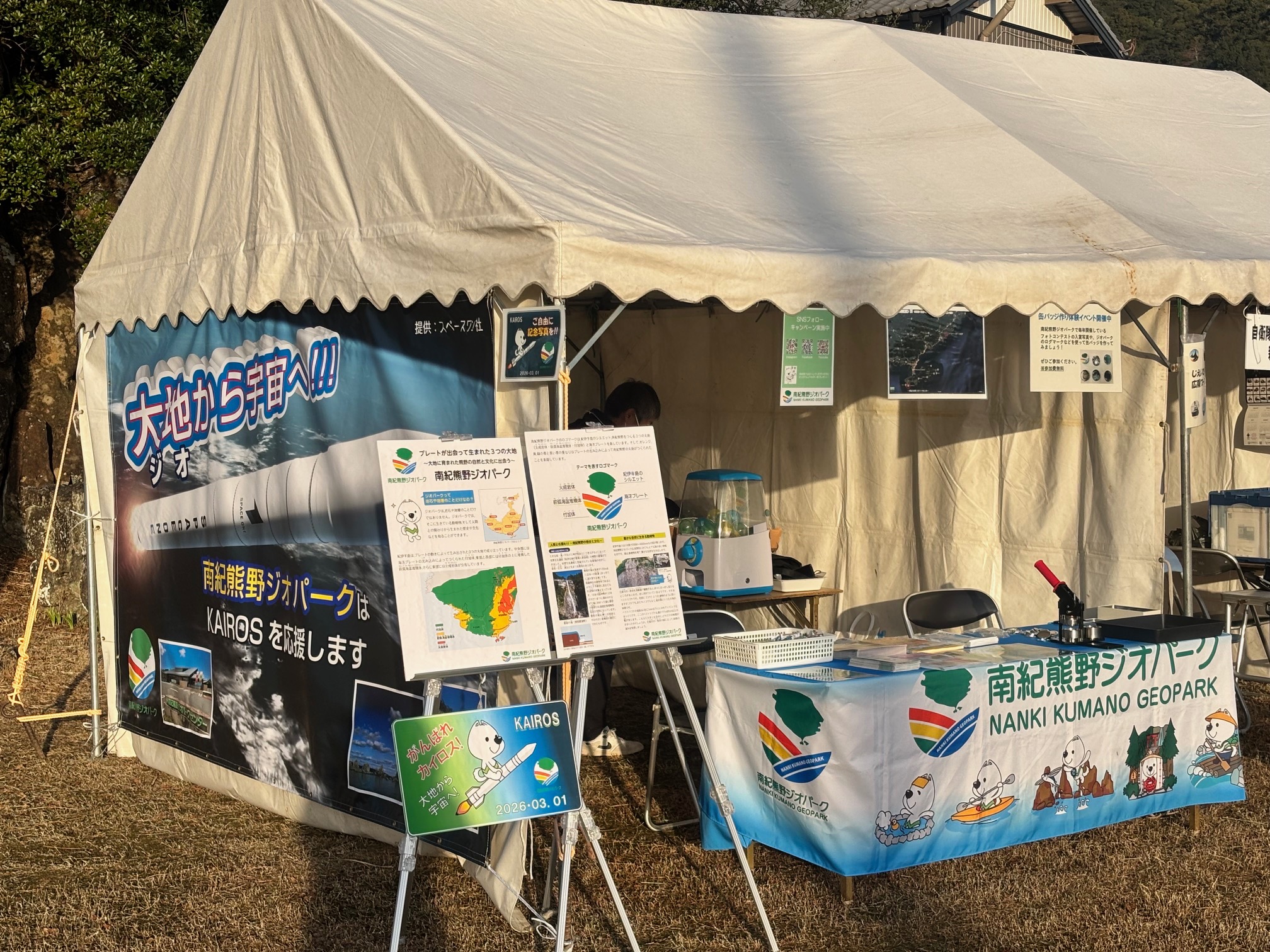 3月1日(日)に、那智勝浦町にあるカイロスロケットの公式見学場の1つである旧浦神小学校にて、南紀熊野ジオパークのブースを設置し、PRを行いました。当日は発射予定時刻まで、たくさんの方々にお立ち寄りいただきました。
