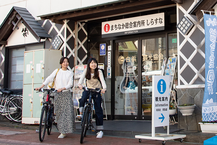 白浜町巡りを楽しむなら、まずは「まちなか観光案内所しらすな」へ。レンタサイクル「白浜びーくる」に乗って観光に出掛けましょう!普通自転車10台、電動アシスト付き自転車(カゴあり)3台、電動アシスト付きマウンテンバイク2台を完備。坂が多い白浜町は、電動アシスト付き自転車がおすすめです。