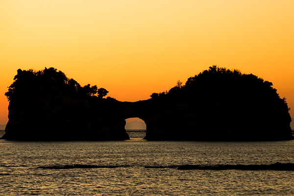 白浜のシンボルとして多くの人に親しまれている円月島は、正式名称「高嶋」、中央にまるい月のような海食洞が空いた、南北130m、東西35m、高さ25mの小島。水平線に沈む陽が円月島の穴を通して見える夕景は特に美しいといわれており、「日本の夕日100選」にも選ばれています。