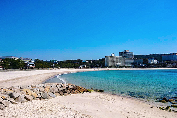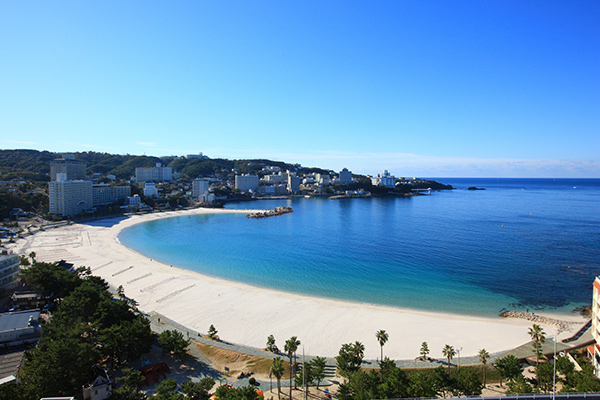 「日本の快水浴場百選」に選ばれ、ハワイ・ワイキキビーチの友好姉妹浜でもある白良浜は毎年海水浴客に大人気。キラキラと輝く海、ビーチに沿って並ぶヤシの木やカラフルなパラソルたちが一層リゾート感を引き立てます。