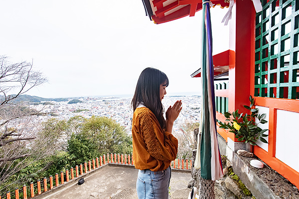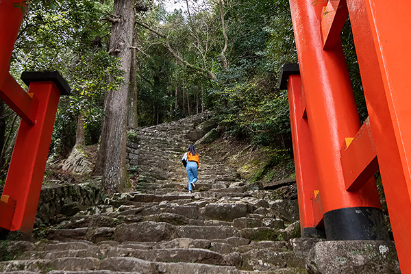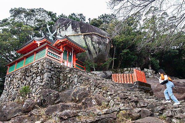 「神倉神社」は権現山の中腹に位置し、熊野三山に祀られる熊野権現が初めて地上に降りたという伝承が残されている古社です。山のふもとから538段の急こう配の石段を昇ると、社殿とご神体「ゴトビキ岩」が目前に。高さ約11m、熊野酸性火成岩類の流紋岩で形成された巨石で、約30mもの長さの大しめ縄が巻かれています。