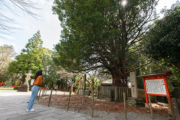 境内には、天然記念物に指定されている樹齢1000年のナギの大樹が鎮座しています。葉の形が左右対称なことから、夫婦円満のご利益があるとも。熊野神宝館には、室町時代の蒔絵手箱や檜扇など、約1200点もの貴重な宝物が保管されています。