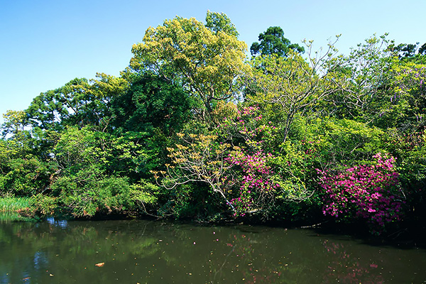 島の中心には、「蛇の穴(じゃのがま)」と呼ばれる“底なし沼”が。おいのという美しい少女が沼に棲む大蛇にのみこまれたという伝説もあり。オオミズゴケやヤマドリゼンマイなど多彩な植物約130種類が群生する珍しい島です。