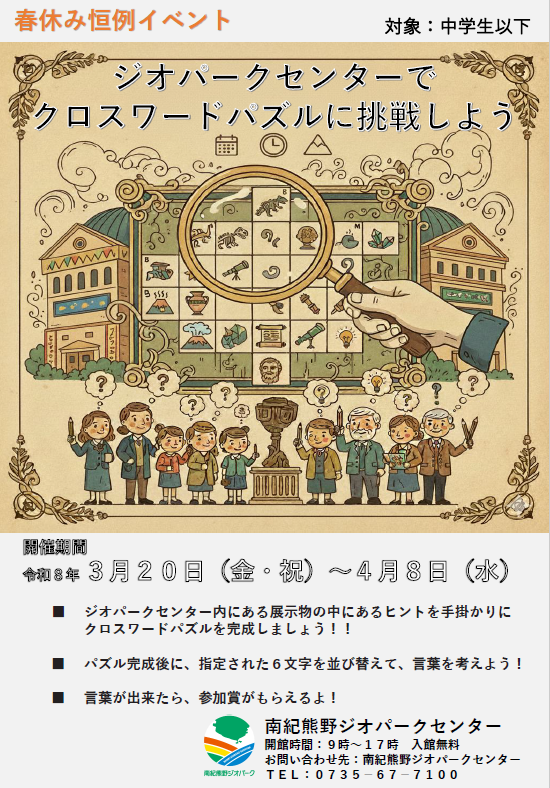 春休みは、南紀熊野ジオパークセンターを探検してクロスワードパズルに挑戦しよう!!