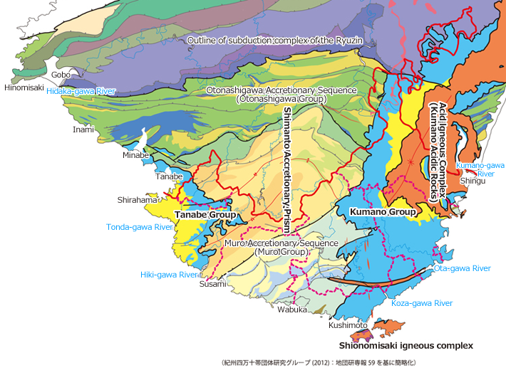 由於紀伊半島的隆起和侵蝕,地表裸露出的三個地質體。.