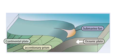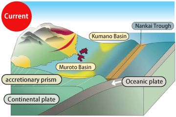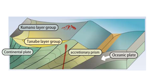 在海底,海洋板塊在大陸板塊之下俯衝。海洋板塊俯衝時,海底的沉積物被推向陸地。最終,這些沉積物附著(增生)到陸地並與之融合,形成了被稱為「增生楔」的南紀熊野地的陸地基盤。