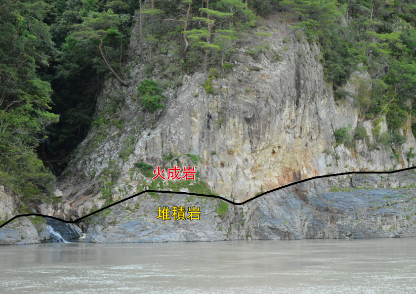 岩漿水平侵入沉積岩層並凝固形成片狀火成岩。岩漿冷卻硬化時收縮形成的規則柱狀裂縫(柱狀節理)創造出獨特而有趣的景觀。熊野川對岸的陡峭岩石表面也同樣是火成岩形成的。