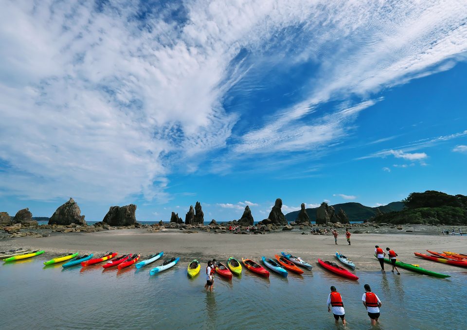 當流速較快的黑潮流過南紀熊野地質公園的沿海地區時,因海灣和巨石較多,形成了許多相對平穩的岩石海岸。海上輕艇和SUP(立式槳板)可以體驗與洶湧波濤的大海融為一體的感覺。從海上眺望陸地,可以盡情欣賞大自然的壯麗風景。
