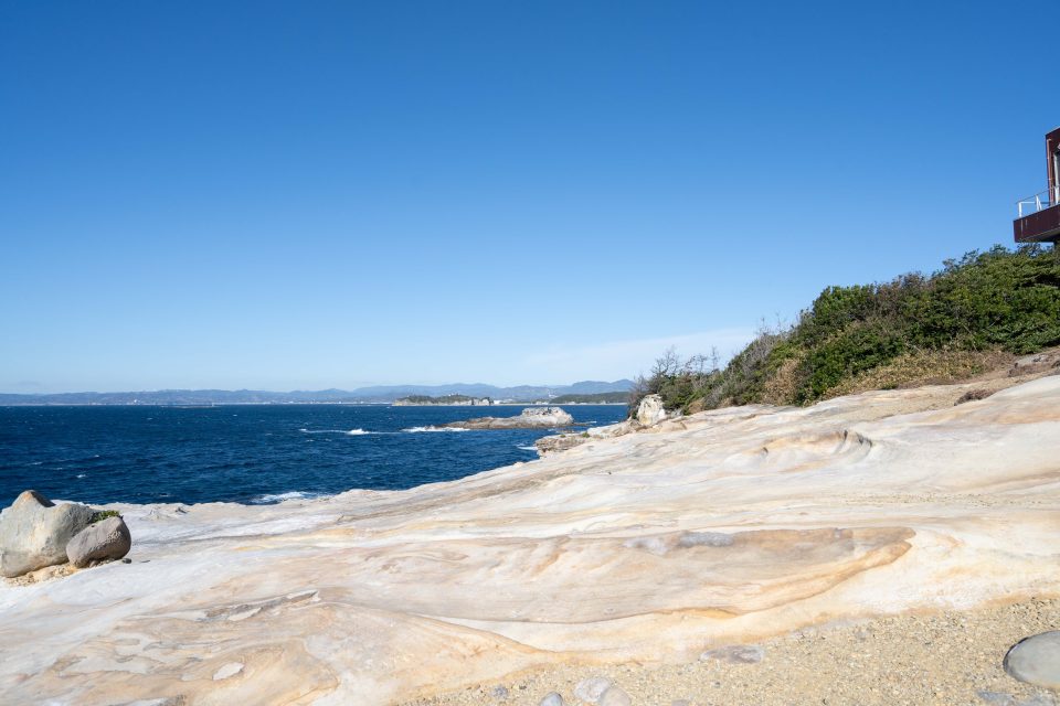 白天,千疊敷被陽光照成耀眼白色,黃昏時分則被染成了橙色。千疊敷是南紀熊野地質公園內最美海岸線之一。由於景色不斷變化,隨時都能欣賞到壯麗絕景。