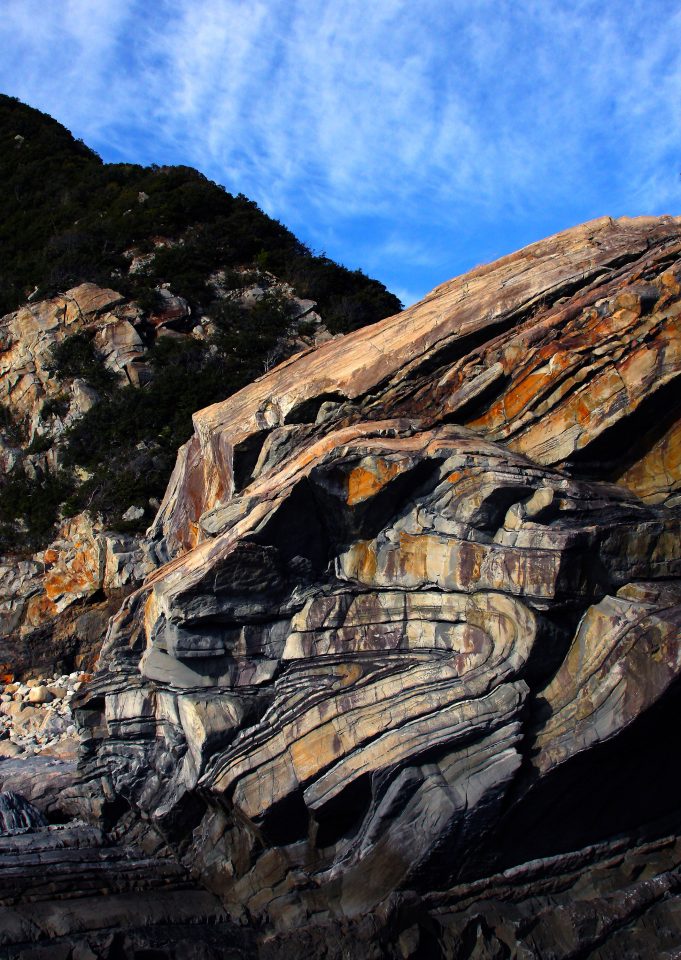 約3000萬年前,海溝累積的地層向陸地隆起並隨著海洋板塊俯衝而壓迫彎曲時就形成了褶曲。這是會讓人不禁為大地巨大力量而震撼的地方。