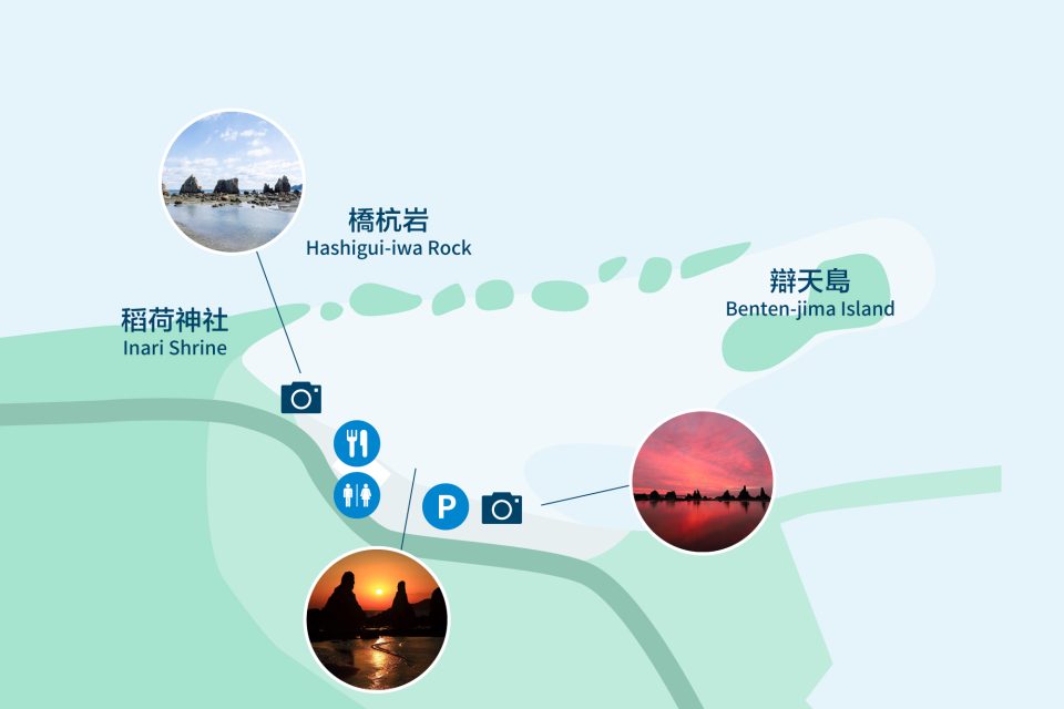 3月到10月期間,有機會能看到橋杭岩與太平洋上升起的日出之景。夕陽映照下的橋杭岩也同樣值得一看。太陽落山時天空不斷變化的漸變色與不可移動的巨石之間形成的鮮明對比絕對值得一看。