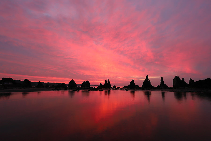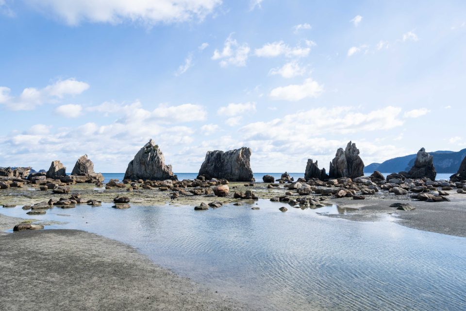 橋杭岩是南紀熊野地質公園的地標,由跨度約850m的巨大岩石連綿形成,從國道42號線可以欣賞到這處岩石風景。橋杭岩是約1500萬年前岩漿在地層內隆起,然後冷卻和凝固的火成岩,後來隆起和侵蝕暴露在地表之上形成。當漲潮無風無浪時,隨著潮水上漲,如鏡般的水面上映出巨大的岩石。而隨著潮水逐漸退去,風景會發生巨大的變化,看起來仿佛是完全不同的地方。