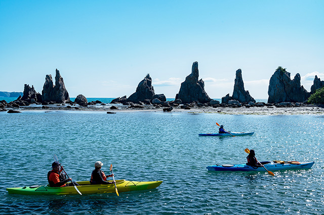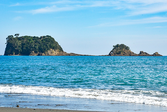 橋杭岩是南紀熊野地質公園的地標,由跨度約850m的巨大岩石連綿形成,從國道42號線可以欣賞到這處岩石風景。橋杭岩是約1500萬年前岩漿在地層內隆起,然後冷卻和凝固的火成岩,後來隆起和侵蝕暴露在地表之上形成。當漲潮無風無浪時,隨著潮水上漲,如鏡般的水面上映出巨大的岩石。而隨著潮水逐漸退去,風景會發生巨大的變化,看起來仿佛是完全不同的地方。